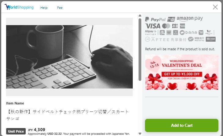 内容: すべてのWorldShopping導入ショップ様において、商品代金1.7万円以上の購入に対し、代理購入手数料を割り引きます。割引額は、注文1件につき最大5,000円(※)期間中、何度でも割引が適用されます。
