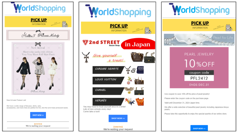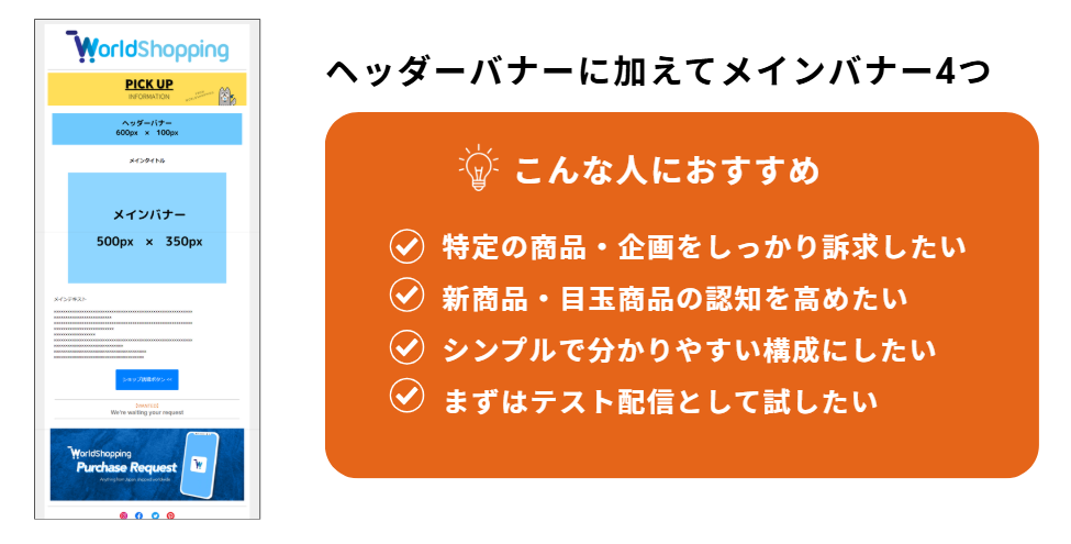 - ヘッダー・フッターなどWorldShoppingメール自体のテンプレート変更はお受けできないことをご了承ください