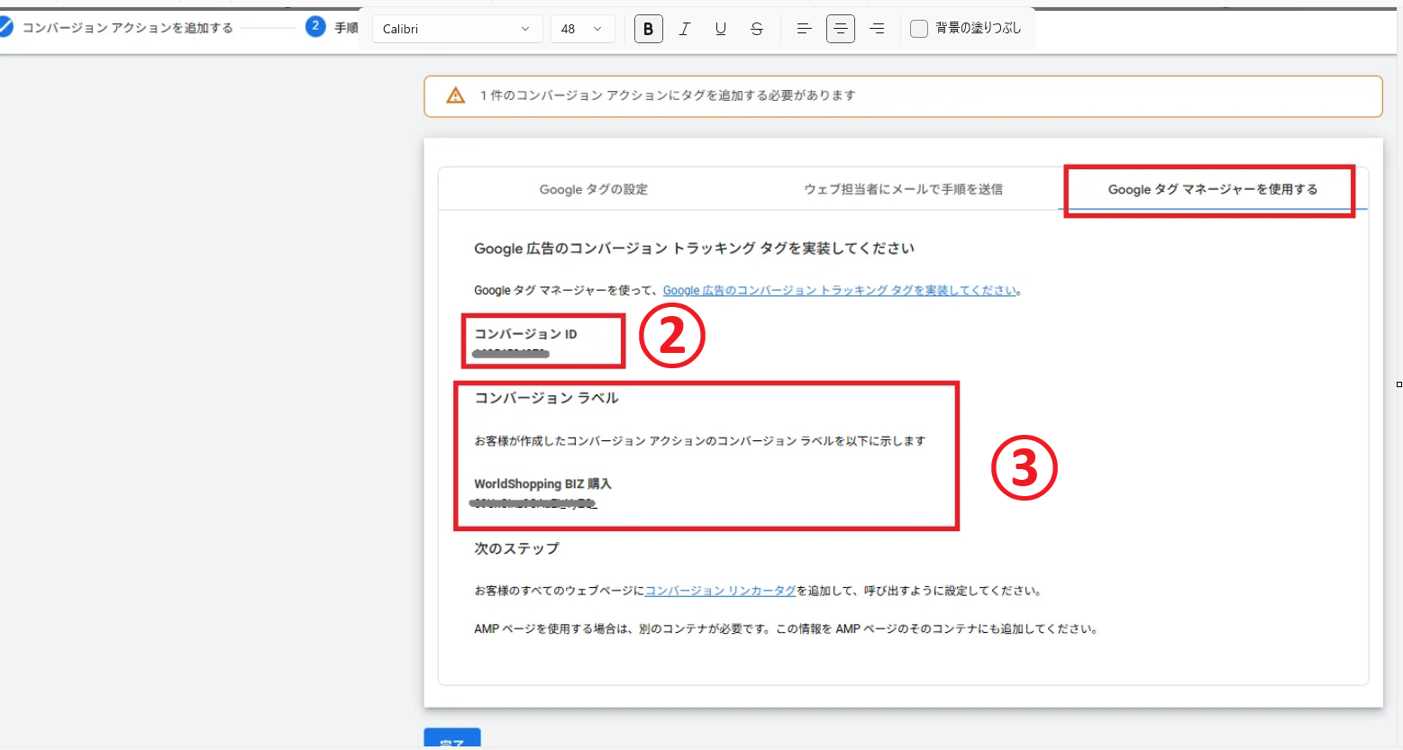 ❼[Googleタグマネージャーを使用する]をクリック後、②[コンバージョンID]と③[コンバージョンラベル]に