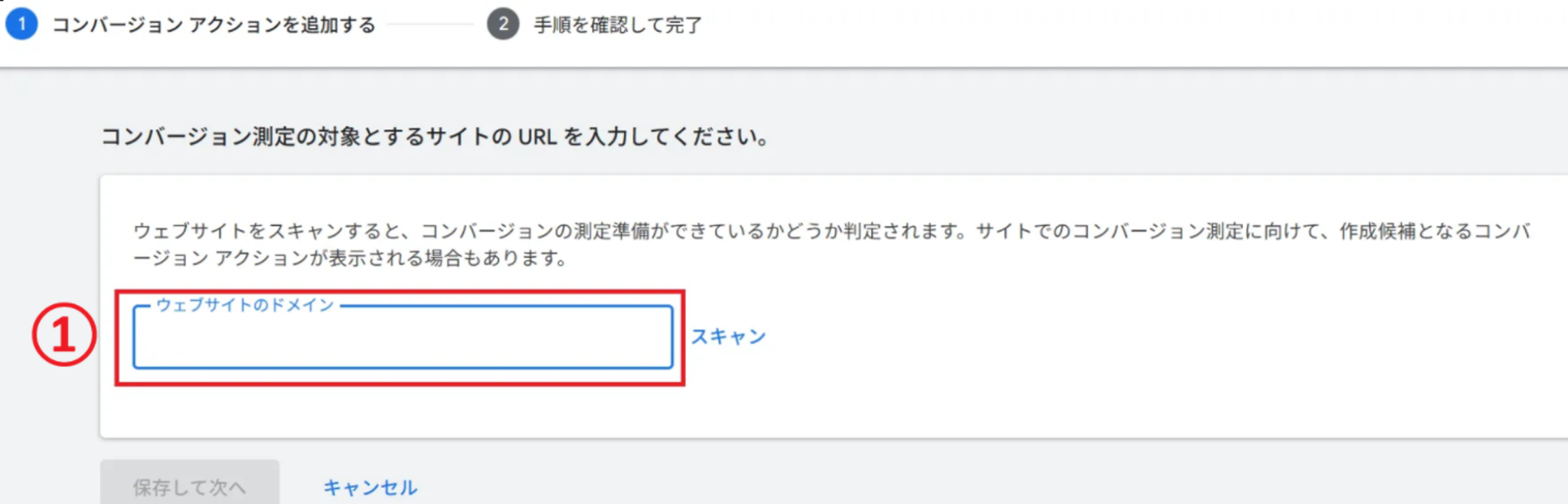 ❸ 広告出稿の対象となる①ショップ様のECサイトドメインをご入力いただき、[スキャン]を実行してください。