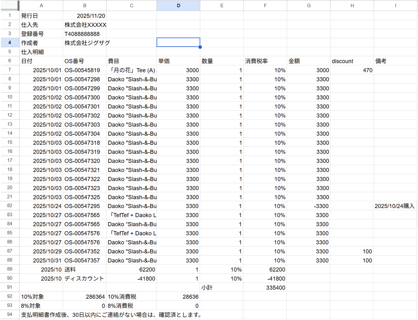 毎月1日に発行しているものになりますので、前月に貴社ショップに発送した点数とお間違いがないかご確認ください。