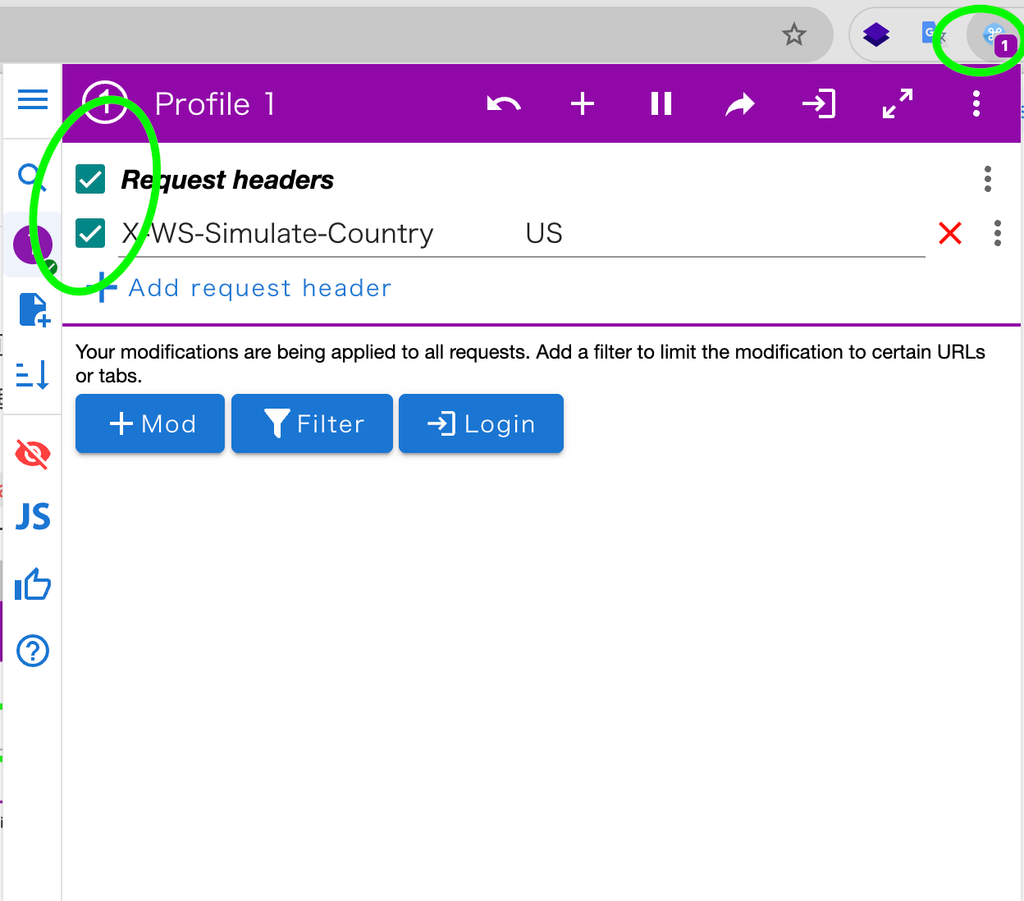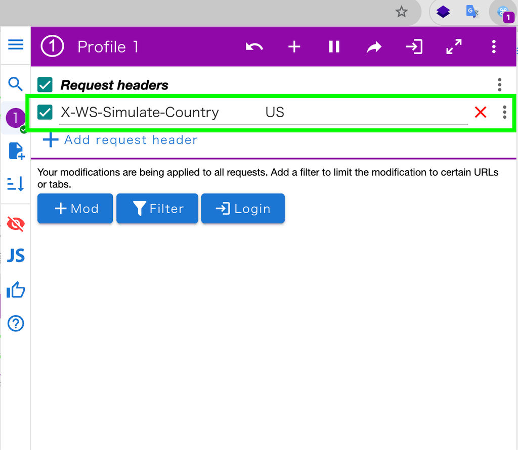 表示だけ確認したい場合は「ModHeader(無料)」をご利用いただければ確認が可能です。