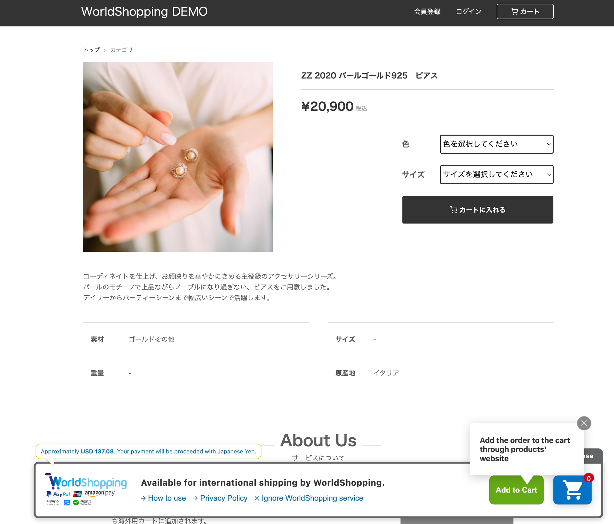 - ショップサイトのAdd to CartボタンをWorldShoppingのカートの動線にする機能は、ブラウザ言語設定が日本語の場合は機能しませんのでご注意ください。