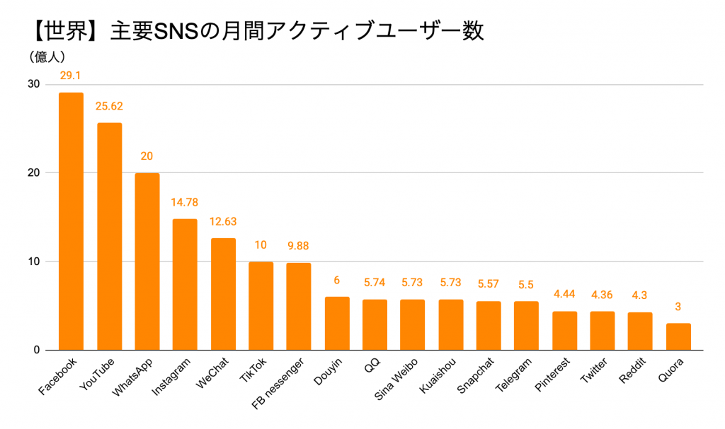 日本では30代以上の利用者が多く、X(Twitter)やInstagramなどのSNSのほうが人気が高いですが、海外では最も多くの月間アクティブユーザーがいることから、越境ECでは外せないプラットフォームです。